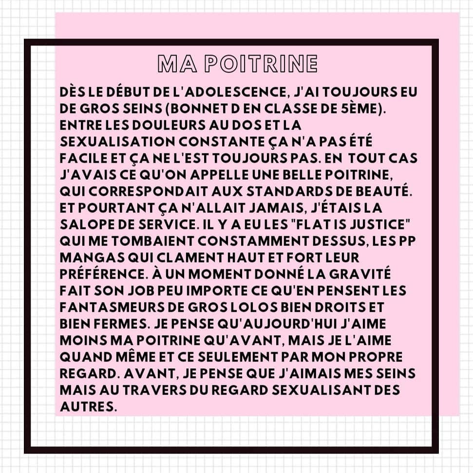 Auparavant, ma poitrine avait beau m’empêcher de voir mes pieds — d’ailleurs est-ce que j’ai des pieds ? — de courir sur de longues distances ou de manger des plats en sauce sans me tâcher, elle était validée par une majorité d’hommes et répondait sans trop de difficulté aux fameuses injonctions que l’on peut voir/lire/entendre un peu partout. Comment cela avait-il pu basculer en si peu de temps ?